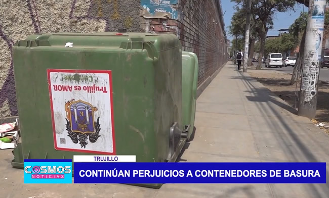 Irresponsables ciudadanos rompieron las llantas y voltearon un contenedor lleno de basura en la av. El Ejército en Trujillo.