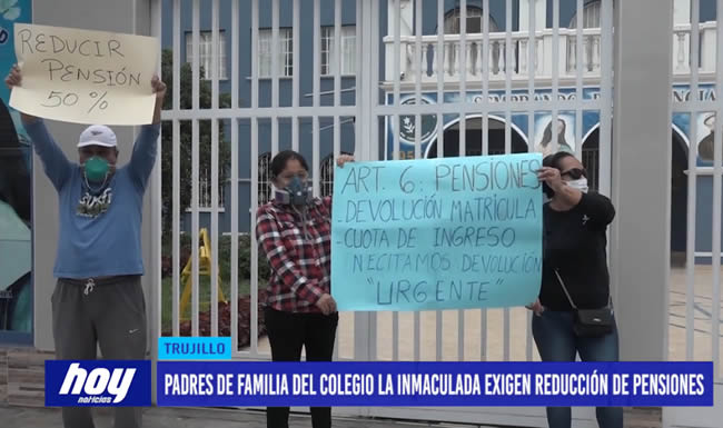 Los padres del colegio La Inmaculada de Trujillo, protestaron en el frontis de la institución y señalan que les exigen pagar la mensualidad de marzo S/ 700 soles y de ahí en adelante les programaron una mensualidad de de 600 soles, descontándoles solamente 100 soles, esto no justifica a los servicios que ofrece el colegio.
