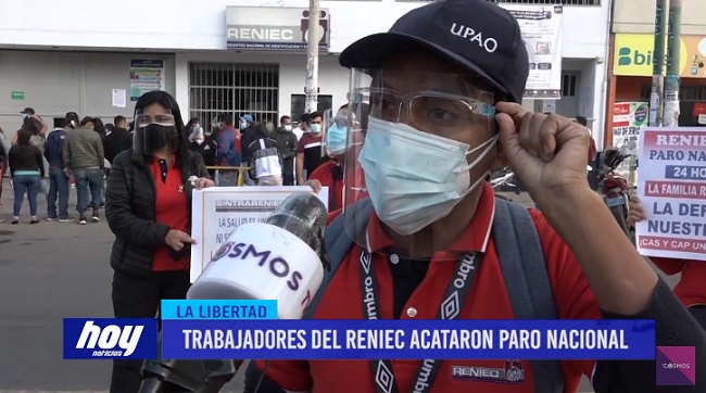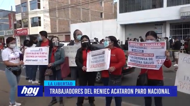 Trabajadores del RENIEC a nivel nacional paralizaron sus labores por 24 horas. En Trujillo, un dirigente dijo que la jefatura no estaría cumpliendo con el plan de seguridad contra el COVID-19. Piden ser incluidos en el proceso de vacunación.