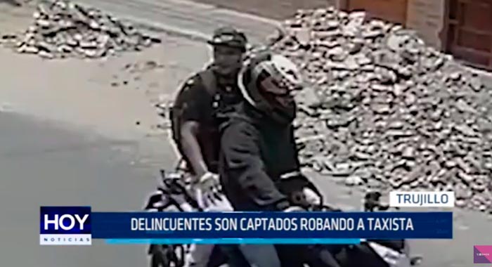 Cámaras se seguridad captaron el preciso momento en que delincuentes a bordo de una motocicleta asaltan, en la modalidad” Al paso”, a un taxista en la urb. Santa Inés, en la ciudad de Trujillo.