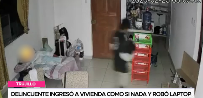 En la madrugada del domingo, este delincuente aprovechó que la familia descansaba para ingresar sigilosamente por la puerta principal de la vivienda, ubicada en la urbanización La Rinconada. En las imágenes se puede apreciar incluso que un integrante de la familia afectada dormía en el lugar y, aunque se movió, continuó durmiendo.