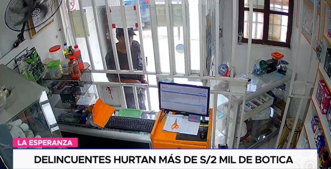 Todo estaba calculado, estos sujetos aprovecharon la hora de almuerzo del responsable de esta botica de La Esperanza para sustraer más de dos mil soles de la caja. Las cámaras de vigilancia del negocio registraron los movimientos de los facinerosos.