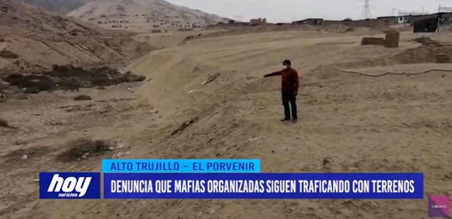 Pide a las autoridades del Ministerio Público y Defensa Civil que actúen ante una posible desgracia. El empresario Carlos Lázaro Collantes, demandó a estas instituciones del Estado, que intervengan en el tráfico de terrenos que se sigue dando por parte de mafias organizadas en el centro poblado de Alto Trujillo.