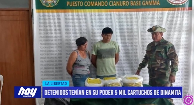 La Policía Nacional de Medio Ambiente de La Libertad, detuvo a 2 personas que transportaban 5 mil cartuchos de dinamita los cuales se presume iban a ser destinados a la minería ilegal. El hecho ocurrió en la localidad de Retamas, distrito de Parcoy, provincia de Pataz, lo incautado asciende al monto de 300 mil soles.