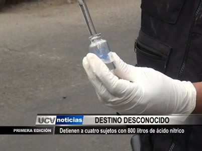 La policía detuvo a cuatro sujetos en poder de más de 11 galones de ácido nítrico. No se descarta que el fin de dicho insumo haya sido el narcotráfico o la minería informal.