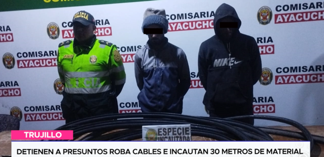 En el marco del operativo policial “Amanecer Seguro”, agentes de la Comisaría Ayacucho “A” y personal del Grupo IRAM de Seguridad Ciudadana de la Municipalidad Provincial de Trujillo lograron la desarticulación de la presunta banda delictiva “Los Eléctricos de La Perla”, dedicada al hurto de cableado telefónico. La intervención se realizó en la madrugada del sábado en la urbanización La Perla, exactamente en la cuadra 3 de la calle John F. Kennedy, donde dos sujetos fueron sorprendidos cortando cables. Los residentes señalaron que los malhechores pasan hasta en triciclos y bicicletas para cometer sus robos.