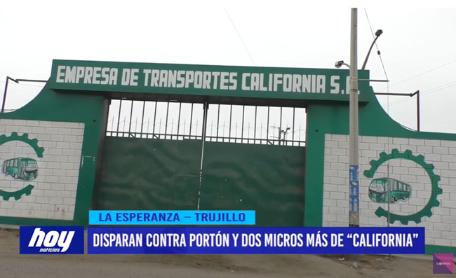 Hasta la fecha son siete los micros de la empresa de transportes “California” S.A. que cubre la ruta La Esperanza, Trujillo y Víctor Larco que son el blanco de ataques a balazos. Este último viernes volvieron a disparar contra éstas dos unidades de placa AYF – 934 y T2X 782 dos sujetos a bordo de una motocicleta. Uno de los vehículos estaba con cuatro pasajeros, nadie resultó ileso. El incidente ocurrió esta vez en el distrito de La Esperanza parte baja.