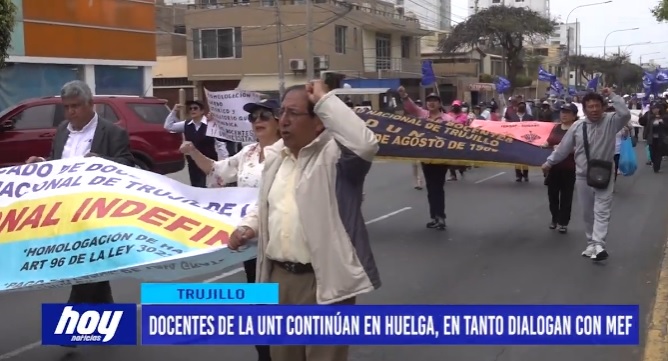 Los docentes de la Universidad Nacional de Trujillo continúan en huelga. El dirigente del SUDUNT, Tomás Felipe indicó que dialogan con una mesa técnica del MEF y esperan que se contemple el incremento de su escala remunerativa.