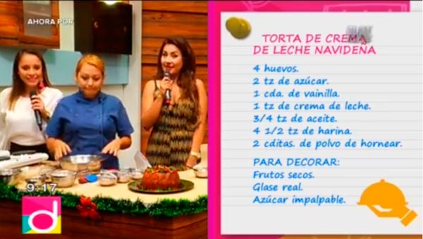En la secuencia «Dulce Tentación» estuvimos acompañados de la carismática chef profesional Milagros Miranda y enseñó a preparar una deliciosa torta de crema de leche navideña.