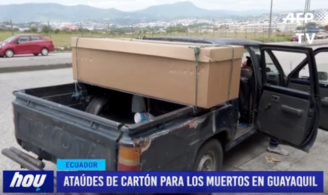 Como si no fuera suficiente, los ataúdes de madera se acabaron. Y la alcaldía de Guayaquil comenzó a repartir féretros de cartón para aliviar la crisis. Merwin Terán, presidente de la Asociación de Funerarias de Guayas, dijo a la agencia internacional de noticias EFE que el gremio está en un momento crítico.