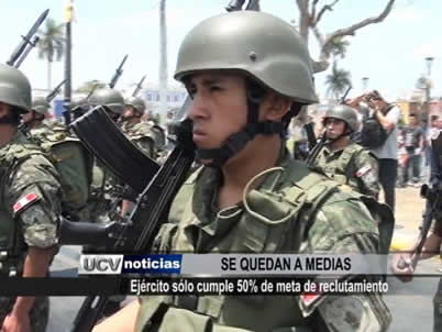 El general de brigada del Ejército del Perú en la región, Martin Del Castillo, informó que hasta el momento el reclutamiento de soldados sólo alcanza el 50% de lo previsto Por ello, está a la espera del sorteo militar que por ahora está frenado.