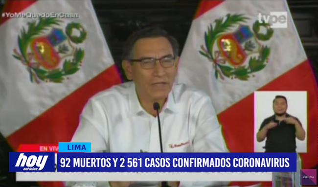 El presidente de la República, Martín Vizcarra, reveló que hay 2,561 casos positivos de coronavirus y un total de 92 muertos por coronavirus se registran a nivel nacional. El mandatario también confirmó que 997 personas que tenían el nuevo coronavirus fueron dadas de alta.