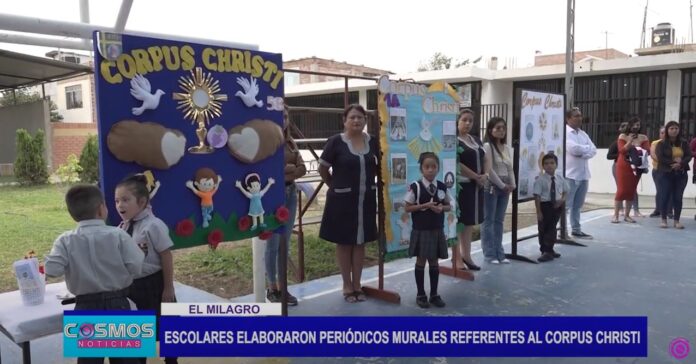 Como parte de la conmemoración del Corpus Christi o solemnidad del cuerpo y la sangre de Cristo; estudiantes de inicial, primaria y secundaria del Colegio Católico Papa Juan Pablo II, en el Centro Poblado el Milagro participaron de un concurso de periódicos murales referentes a esta celebración de la Iglesia Católica.