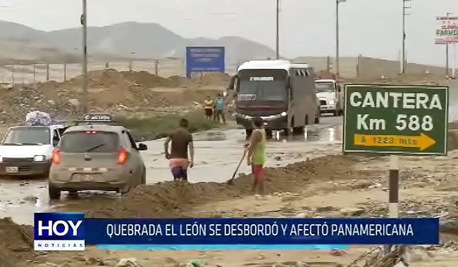 Una vez más la quebrada El León se desbordó. En esta ocasión las aguas discurrieron por un brazo de la quebrada que pasa por el kilómetro 588 de la Panamericana Norte y afectaron a la infraestructura vial.