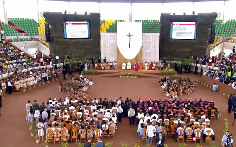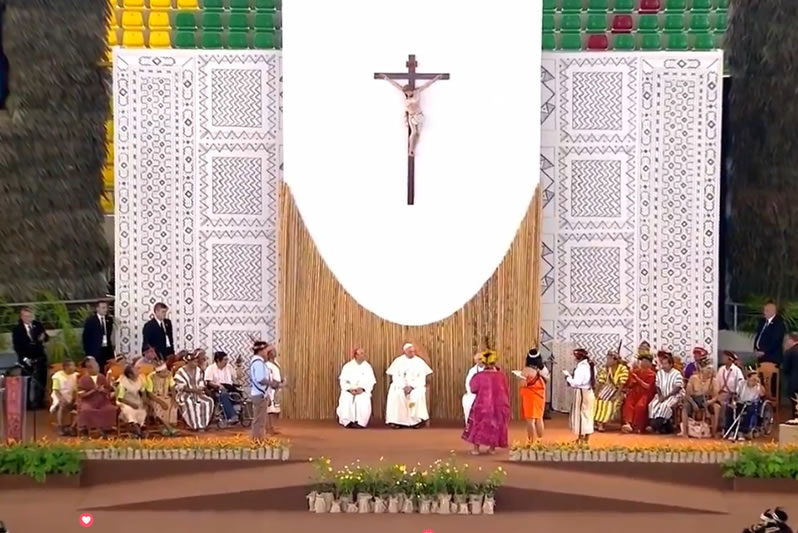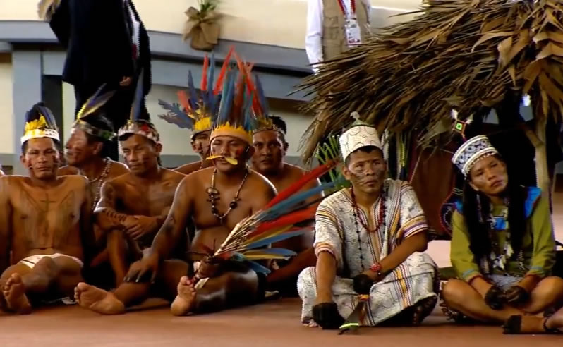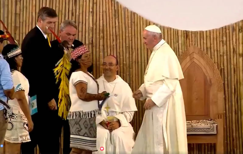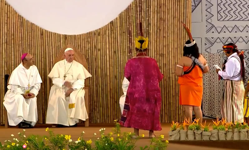 El papa Francsico se dirigió a las diversas comunidades indígenas con un discurso en el que puso énfasis a la interculturalidad, la inclusión de los pueblos originarios y la defensa de la Amazonia. «La Amazonía es una tierra disputada desde varios frentes».