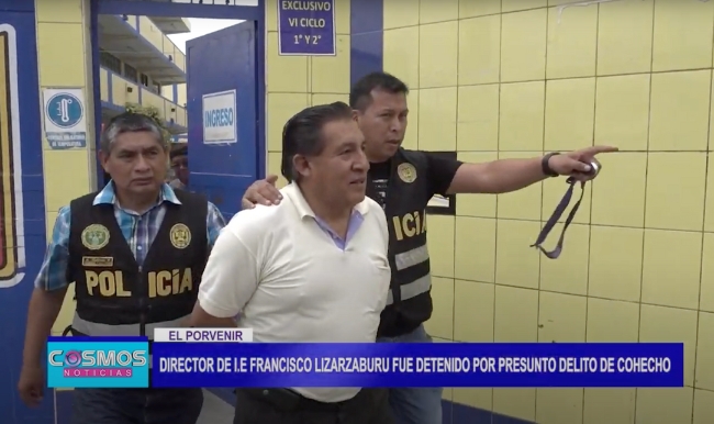 Con grilletes y completamente resguardado, este jueves, el director de la I.E Francisco Lizarzaburu, Álvaro Sánchez, del distrito del El Porvenir fue detenido por el área anticorrupción de la Policía Nacional.