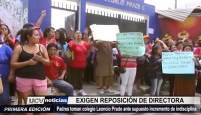 Padres de familia tomaron el colegio Leoncio Prado, de El Porvenir, exigiendo la reposición de la directora Elizabeth Quirós, quien fue separada por supuestamente agredir a los estudiantes. Aseguran que los alumnos intentan imponer la mala conducta.