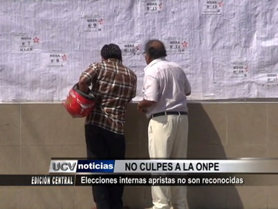La Oficina Nacional de Procesos Electorales confirmó que las elecciones internas del Partido Aprista Peruano carecen de validez al no estar programadas dentro del tiempo estipulado por el reglamento interno. El secretario regional del APRA, Carlos Martínez; tuvo que reconocer esta situación y afirmó que los candidatos serán elegidos en una convención nacional que se realizará en Lima en el mes de abril.