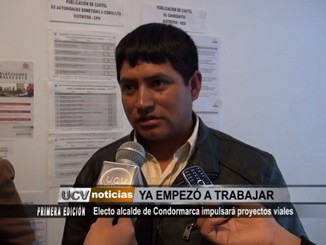 El electo alcalde distrital de Condormarca, Segundo Sopla, señaló que en su periodo impulsará proyectos viales y trabajará por otorgar los servicios básicos a sus más de tres mil pobladores.