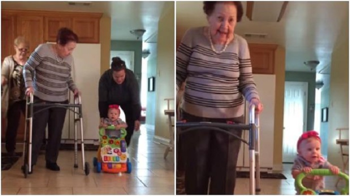 La bisabuela, quien por su edad utiliza un andador, disfrutó del momento junto a su bisnieta; al parecer, la anciana de 95 años goza de buena salud y no duda en jugar con la niña, quien con su andador de juguete avanza lentamente junto a la mujer.