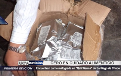 La Red de Salud de Santiago de Chuco decomisó carne aparentemente malograda que había sido entregada al programa Qali Warma para desayunos y alimentos escolares. El gerente de Educación, Rafael Moya, exige sanción a los responsables.