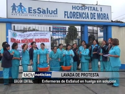 Las enfermeras del Hospital I de Florencia de Mora, realizaron un plantón y lavaron sus uniformes en el exterior del referido establecimiento de EsSalud, para exigir mejoras laborales.