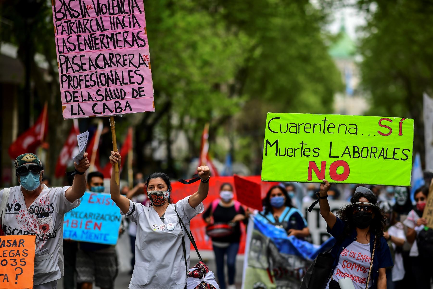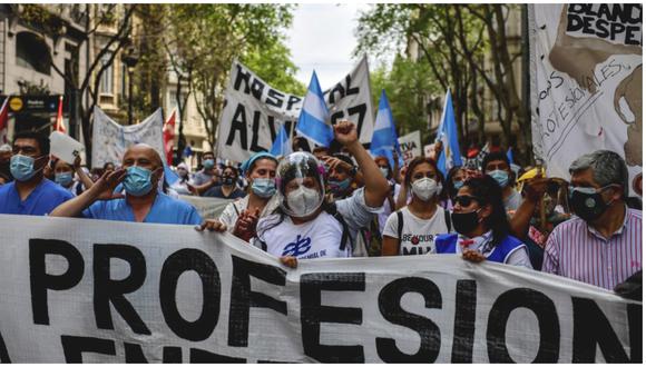 Buenos Aires, Argentina (AFP).- Más de medio millar de enfermeros e instrumentistas quirúrgicos marcharon este jueves por el centro de Buenos Aires en reclamo de aumentos salariales, reconocimiento profesional y mejoras en las condiciones laborales en plena pandemia de COVID-19.