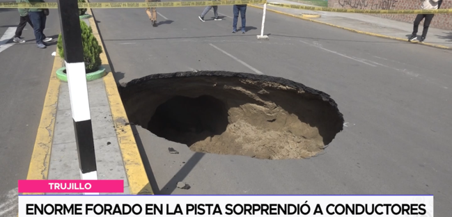 Un gran forado de aproximadamente cuatro metros de profundidad se originó en la cuadra 8 de la avenida España, muy cerca de la piscina olímpica de la ciudad de Trujillo. Un peatón fue testigo del preciso momento en que la pista cedió, generando alarma entre los transeúntes y conductores que circulaban por la zona.