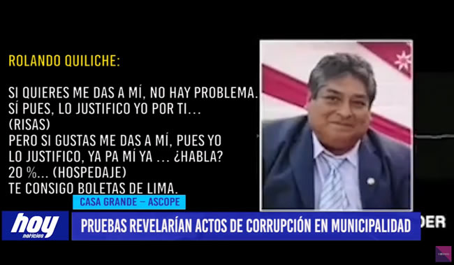Se trata de la grabación de una conversación liderada por el gerente general de Casa Grande, Daniel Moreno Gutiérrez, quien detalla cómo debe ser la sustentación de gastos por concepto de viáticos; en la explicación interviene el teniente alcalde Rolando Quiliche Llamoga, quien bajo la venia del gerente edil, idea la forma de como apropiarse del dinero del estado, con la compra de boletas en el hotel.