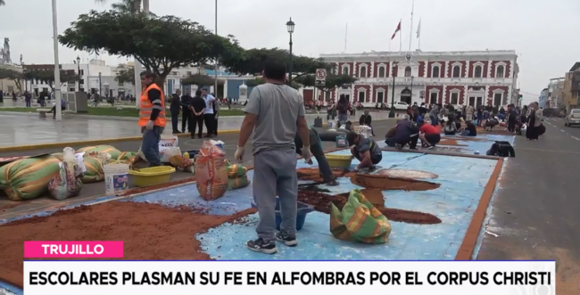 La actividad se llevó a cabo en la Plaza Mayor de Trujillo, donde decenas de alumnos se congregaron desde tempranas horas. Con paciencia y dedicación, los jóvenes transformaron el suelo en verdaderas obras de arte.