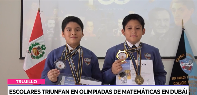 Edwin Baldomero Yupanqui de 12 años de edad y Santiago Daniel Hernández Tello de 11 años, estudiantes del colegio Seminario de San Carlos y San Marcelo de Trujillo, hicieron historia al representar a su institución en la 6ta Olimpiada Internacional de Matemáticas Copernicus, realizada en Dubái.