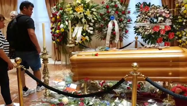 El féretro estuvo rodeado de imponentes arreglos florales, cientos de rosas blancas y rojas, banderas de diversos países y acompañado de dos grandes fotografías del cantante quien falleciera a los 72 años de edad a consecuencia de un paro cardiorespiratorio debido a sus problemas renales. Su hijo Camilo Blandes, llegó esta mañana procedente de México recibiendo las condolencias por parte de sus demás familiares, amigos muy cercanos y artistas internacionales quienes se mostraron muy conmovidos por la partida de Camilo Sesto.