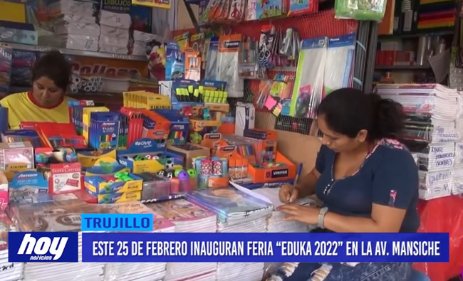 La feria escolar “Eduka 2022” se desarrollará hasta el 10 de abril, en la calle adyacente a la avenida España cuadra 7 y la Alameda Mansiche, donde desde este 25 de febrero podrán encontrar gran variedad de productos escolares a todos los precios y de la mejor calidad.