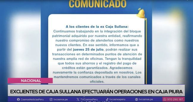 Mediante un comunicado en sus redes sociales, la entidad financiera Caja Piura informó que los clientes de la ex Caja Sullana podrán realizar sus transacciones en determinados puntos de su red de oficinas a partir de este jueves 25 de julio.