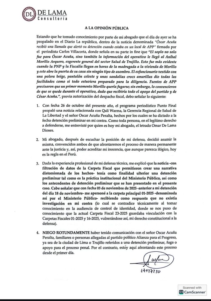 Morillo, a través de una consulta elaborada por su abogado, Omar De Lama Dioses, emitió un comunicado a la opinión pública para responder a una noticia publicada en el diario La República. Dicha noticia, firmada por el periodista Carlos Villacorta, sugería que Morillo y Óscar Acuña recibieron un «soplo» sobre el operativo fiscal, lo que explicaría la supuesta serenidad del exfuncionario al momento de la intervención.