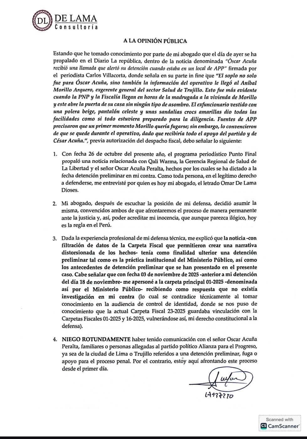 Morillo, quien enfrenta una detención preliminar a raíz de una noticia relacionada con Qali Warma, la Gerencia Regional de Salud de La Libertad, y Óscar Acuña Peralta, difundida el 26 de octubre por Punto Final, cuestionó aspectos del manejo fiscal de su caso.