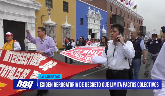 Decenas de trabajadores afiliados a diferentes gremios que conforman la cite marcharon por las calles de la ciudad de Trujillo exigiendo la derogatoria del Decreto Supremo N° 261, que consolida los ingresos del personal administrativo.