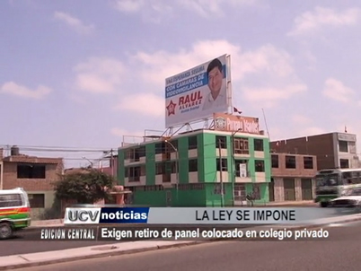 El Jurado Electoral Especial y la Gerencia Regional de Educación exigen al candidato por el partido aprista, Eaúl Álvarez, que retire el panel ubicado en la azotea de un centro educativo privado.