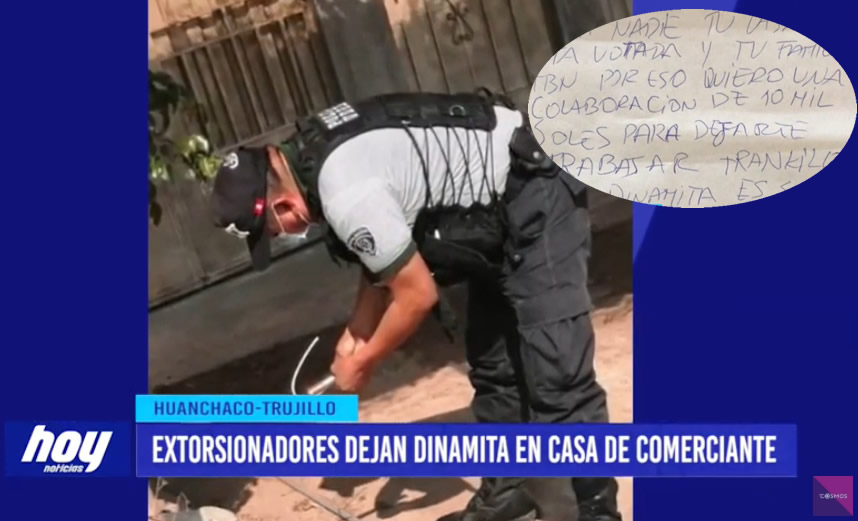 El agraviado de 34 años , manifestó que se asustó cuando encontró el explosivo en su casa del asentamiento humano Víctor Raúl y es por ello que de inmediato pidió apoyo a la policía nacional , pues los delincuentes le dejaron además un manuscrito exigiendo la fuerte cantidad de dinero, en un plazo de 24 horas, de lo contrario iban a ubicarlo porque conocían todos sus pasos, al parecer lo estaban siguiendo, tras ser alertados, agentes de la Unidad de Desactivación de Explosivos (UDEX) llegaron al lugar y neutralizaron el detonante que tenía una mecha de 25 centímetros.