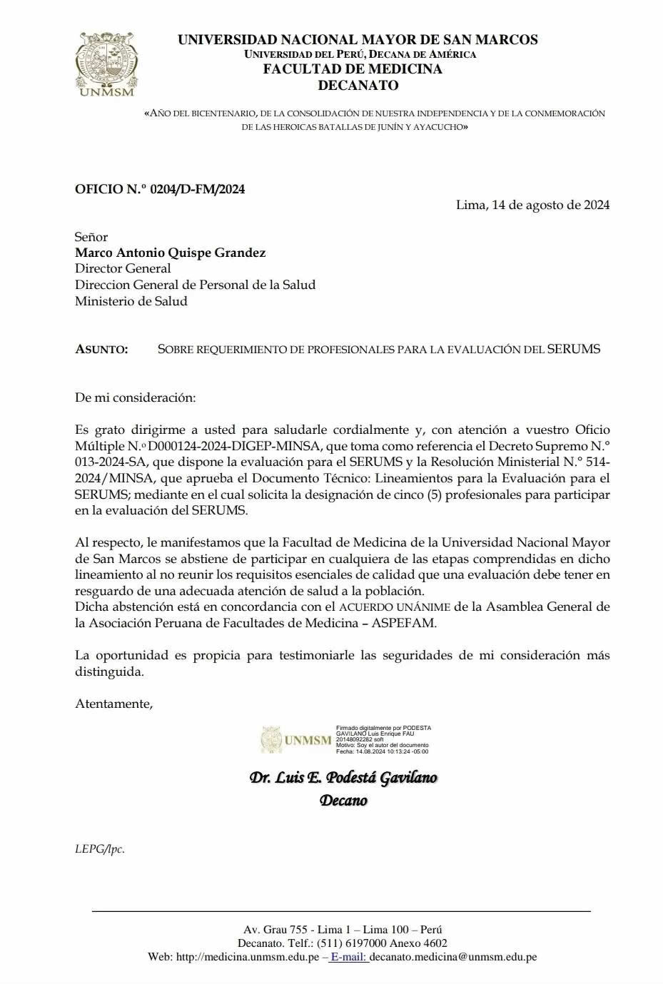 En un comunicado oficial dirigido a Marco Quispe, director General de Personal de Salud del Minsa, el decano Luis Podestá explicó que la facultad considera que el proceso no cumple con los requisitos esenciales de calidad necesarios para asegurar una adecuada atención de salud a la población. La decisión se basa en una evaluación interna y está alineada con un acuerdo unánime de la Asamblea General de la Asociación Peruana de Facultades de Medicina (ASPEFAM).