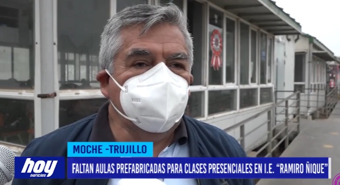 Padres de familia de la I.E Ramiro Ñique de Moche, reclaman ante ausencia de clases presenciales. Director del colegio Armando Flores señala que alumnos solo llevan un día de clases presenciales debido a que solo cuentan con 10 aulas prefabricadas. Asimismo, señaló que falta personal de servicios.