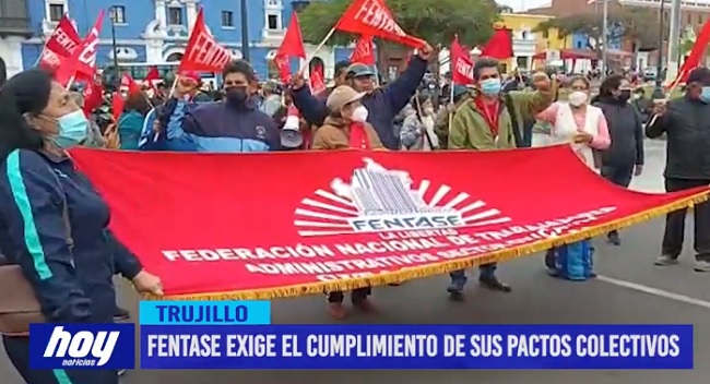Con pancartas y banderolas en mano, integrantes de la Federación Regional de Trabajadores Administrativos – FENTASE, marcharon por las calles del centro de la ciudad de Trujillo, para exigir el cumplimiento de sus pactos colectivos, que corresponde a un total de 2000 trabajadores en La Libertad.