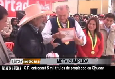 Con la entrega de más de cinco mil títulos de propiedad, el Gobierno Regional estará cumpliendo la meta establecida: titular al 100% de la población rural. El Gobierno Regional ha invertido cerca de tres millones de soles en títulos y certificados de posesión para el distrito de Chugay en la provincia de Sánchez Carrión.