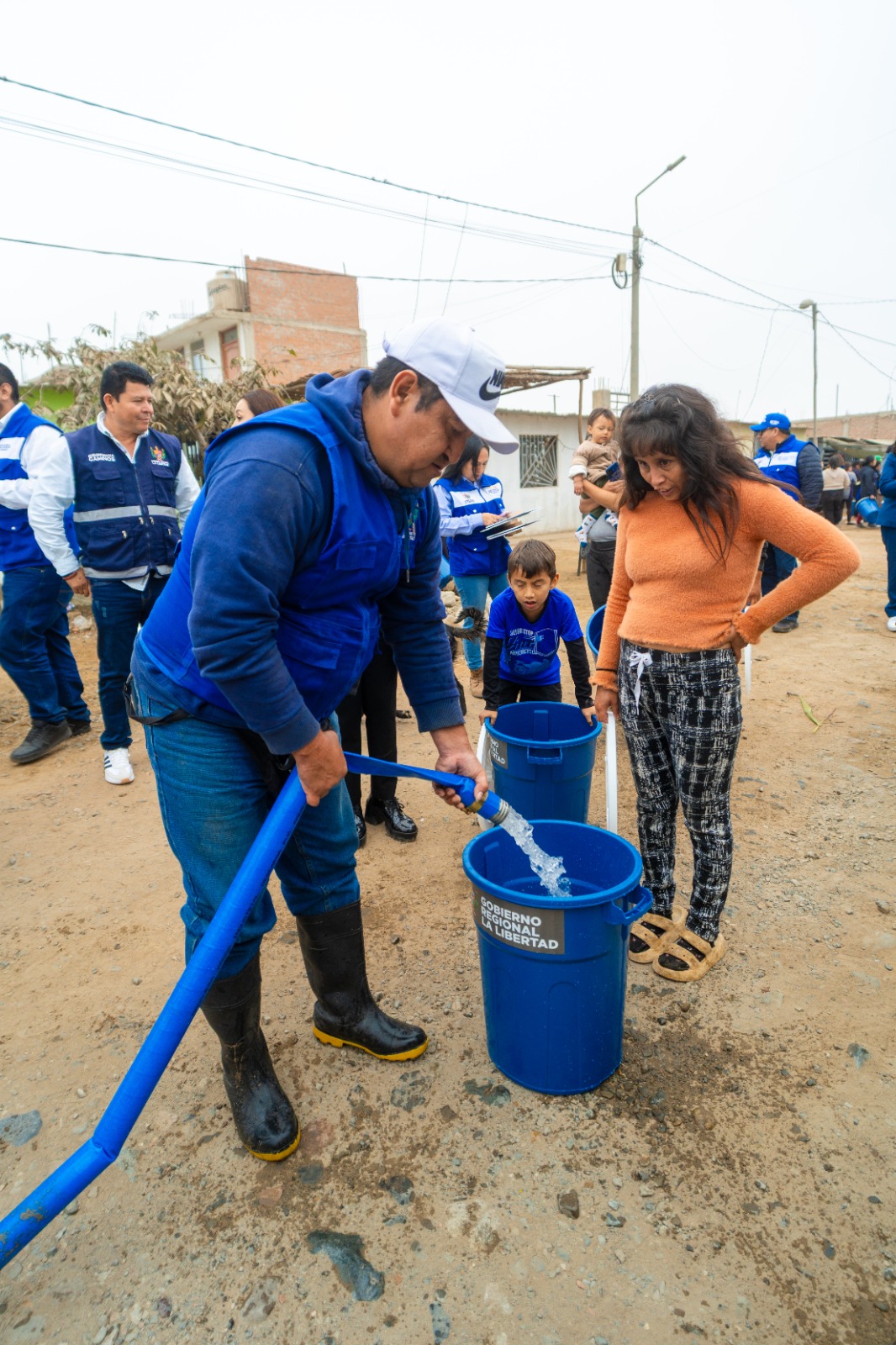 El Gobierno Regional de La Libertad, a través de la Gerencia Regional de Vivienda, Construcción y Saneamiento, viene entregando semanalmente más de 1 millón de litros de agua potable a familias en situación de vulnerabilidad de cinco distritos de la provincia de Trujillo. Esta iniciativa forma parte del programa “Agua es Vida”, impulsado por el gobernador regional, César Acuña.