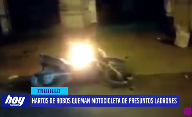 Los vecinos y comerciantes de la avenida Ricardo Palma hartos de los frecuentes robos y asaltos en la zona, quemaron una motocicleta presuntamente de unos ladrones que lograron escapar.