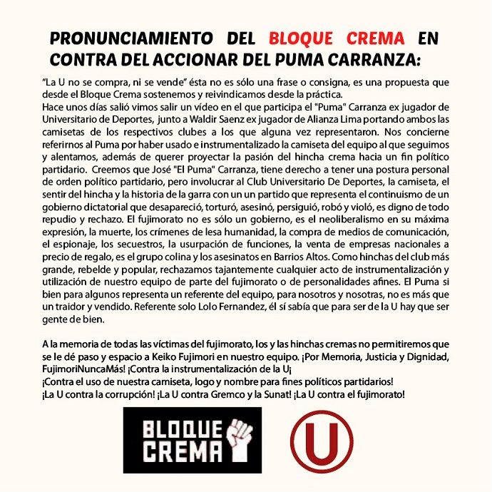 Antes de terminar con el escrito, los hinchas del Bloque Crema dejaron en claro su postura: “Rechazamos cualquier acto de utilización de nuestro equipo para el fujimorato. El Puma, para nosotros, es un traidor vendido”.