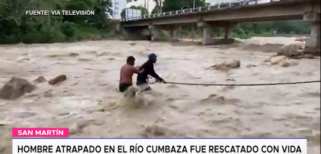 La fuerte crecida del río Cumbaza sorprendió a un hombre que quedó atrapado entre las caudalosas aguas, debajo del puente que cruza este afluente en la región San Martín.