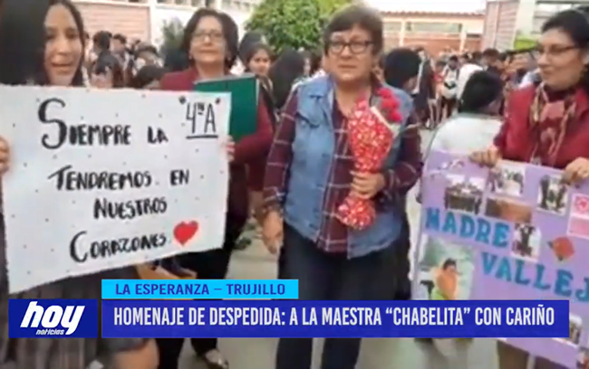 Un merecido homenaje de despedida recibió una docente por parte de sus alumnos del nivel secundario de la I.E. César Vallejo en el distrito de La Esperanza.