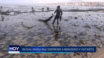 La playa de Huanchaco se ha convertido en punto de pesca para visitantes y moradores, debido a la gran cantidad de piedras y la inusual retirada del mar en horas de la mañana.
