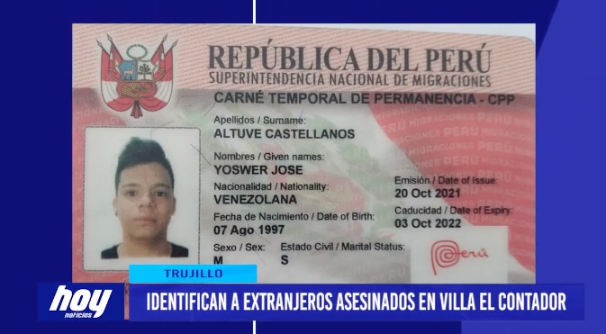 Fueron identificados los dos ciudadanos de nacionalidad venezolana que fueron asesinados anoche en la urbanización trujillana Villa Contador. Se trata de los hermanos: Yoswer José Altuve Castellanos de 24 años de edad y Jojer Jose Rafael Altuve fueron identificados los dos ciudadanos de nacionalidad venezolana que fueron asesinados anoche en la urbanización trujillana Villa Contador.
